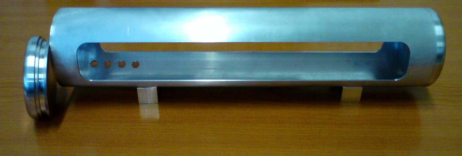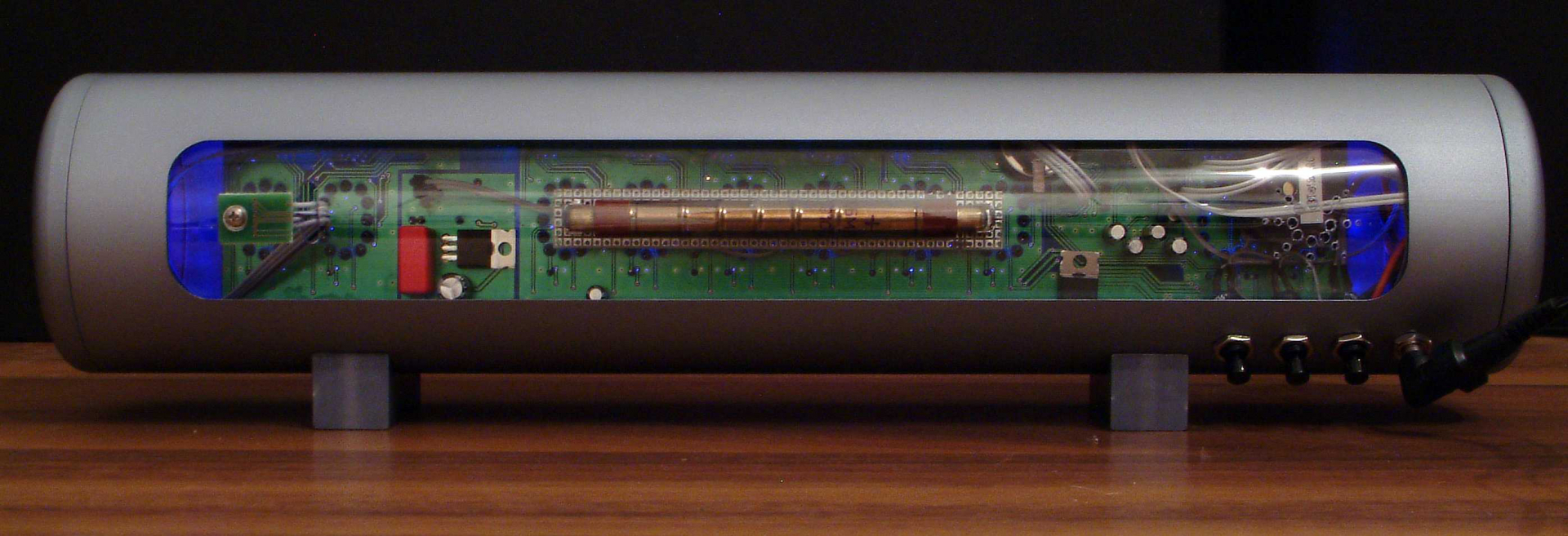 The enclosure is machined from a thick aluminium tube with the end caps and feet. All these parts were then sandblasted and anodized to a shade of titanium colour. The labels and radiation symbols are laser engraved.